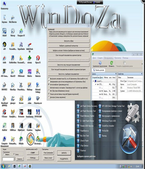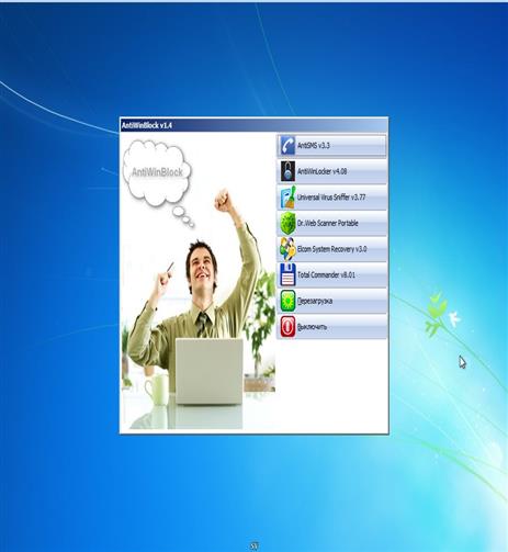 Загрузочный диск, основанный на Windows 7 PE, включающий комплекс инструментов для восстановления системы после блокирования SMS баннером. Предназначен для борьбы с Trojan-Ransom.Win32 blocker и другими разновидностями блокираторов.Сборка имеет достаточное количество установленного софта для работы с разделами HDD, подключения к сети ,выхода в интернет ,восстановления системы, утерянной информации и для решения других проблем. Состав: = 7-zip -Архиватор = AkelPad -Текстовый редактор с открытым исходным кодом, созданный, чтобы быть маленьким и быстрым = AIDA64 Extreme Engineer -Информация о компьютере,железе,ОС = AVZ 4 -Антивирус Зайцева. Очень полезен при удалении руткитов = BOOTICE –Инструмент для манипуляции загрузочными секторами... = Drivexp -Это очень удобная утилита для создания копий драйверов системы. = Internet Explorer 8 -Многофункциональный браузер = NTPWEdit -Это программа для редактирования паролей в системах семейства Windows NT = Opera 11.62 -Многофункциональный браузер = Paragon Alignment Tool -Утилита для выравнивания несовпадения кластеров логических разделов = PasWdRenew -Сброс и замена паролей в Windows = PENetwork -Конфигурация сети. = Smart Driver Backup -Небольшая бесплатная утилита для создания резервных копий установленных в системе драйверов = Super Finder -Мощная замена встроенной в Windows системе поиска = Total Commander -Файловый менеджер = Universal Virus Sniffer 3.74 + -Предназначен для борьбы с неизвестными вирусами и не только = WinHex -Универсальный редактор в шестнадцатеричной системе = Win Snap -Утилита предназначена для создания и редактирования снимков экрана (скриншотов) = xCHM –Утилита, позволяющая открывать файлы с руководствами и хелпами в формате CHM = Acronis® True Image™ Home 2011 Plus Pack -Резервное копирование и восстановление = Acronis® Disk Director™ 11 Home -Работа с разделами HDD = Acronis® Recovery Expert - Обеспечивает полную защиту Ваших данных, позволяя восстанавливать удаленные или потерянные разделы = Anti WinLocker CD 3.3 -Разблокировка Windows от СМС баннера = CCleaner –Бесплатная программа для оптимизации и очистки системы, а также инструмент обеспечения безопасности пользователя = Piriform Defraggler -Компактный и качественный дефрагментатор файловой системы, который может работать как с целым диском, так и с отдельными файлами = Ghost32 -Программа очень хороша для клонирования или создания резервной копии = Ghostexp -Маленькая утилита работает только под Windows. В основном она предназначена для просмотра содержимого образов. = Gimagex -Графический интерфейс (GUI) для ImageX. Реализует все те же функции, что и ImageX, но в более дружественном пользователю оконном виде = Handy Recovery - Одна из самых известных и надёжных программ для восстановления данных после случайного удаления, форматирования диска, вирусной атаки = Hetman Uneraser -Восстановление информации с жестких дисков, съемных дисков, карт памяти фотокамер, USB флешек = Recuva -Программа для восстановления файлов, случайно удаленных с жестких дисков вашего компьютера = Restorator -Говоря техническим языком, это редактор ресурсов для многих типов файлов = RStudio -Лучшее на сегодняшний день программное обеспечение для восстановления данных = Unlocker -Программа позволяет удалить файлы и папки, которые обычным способом удалить не удается = Victoria -Программа для тестирования, диагностики и сервисного обслуживания IDE и Serial ATA винчестеров = Img Burn -Программа позволяет записывать и считывать образы дисков, а также отдельно создавать образы не записывая их, или же работать в р